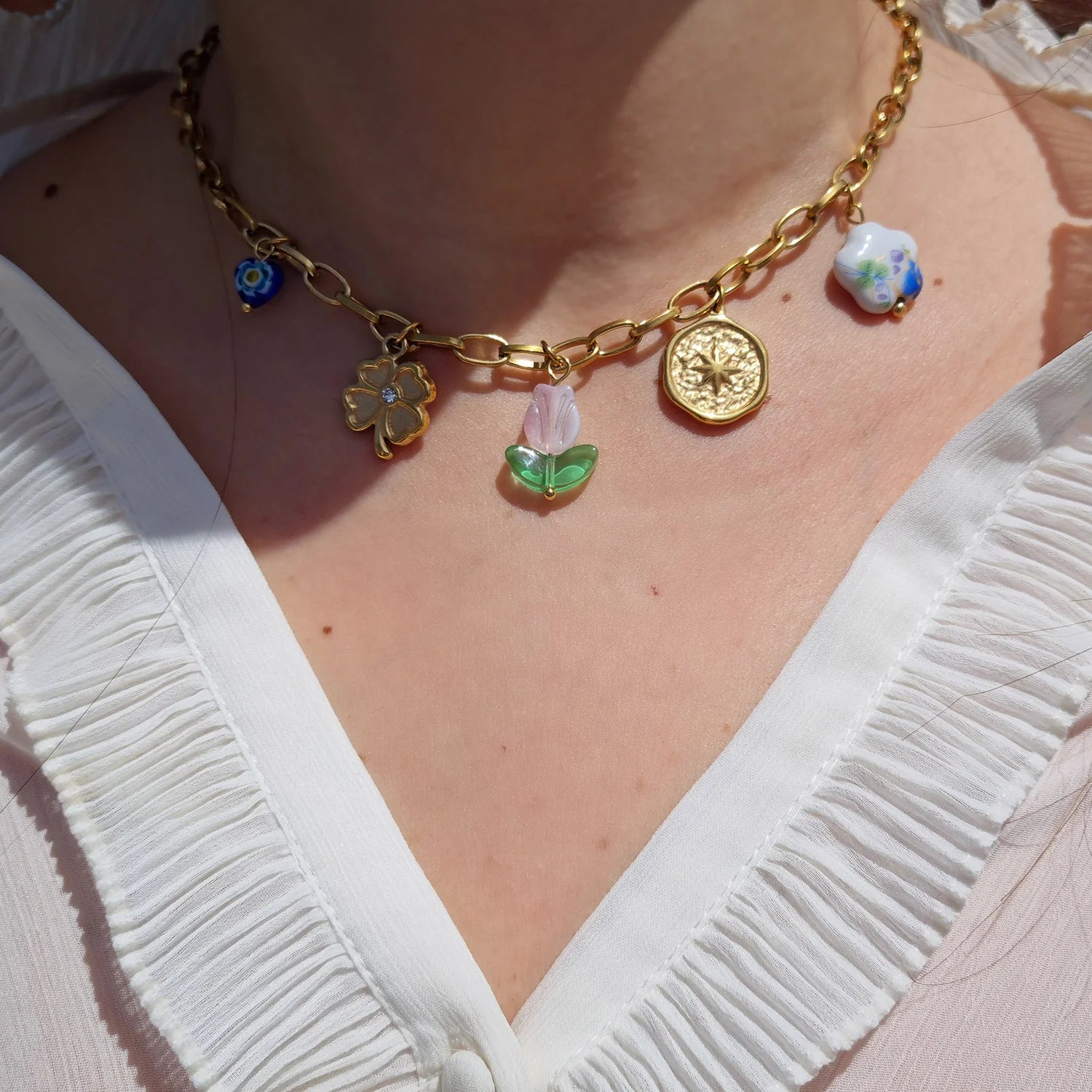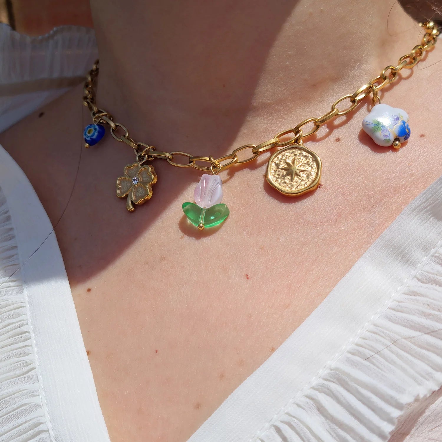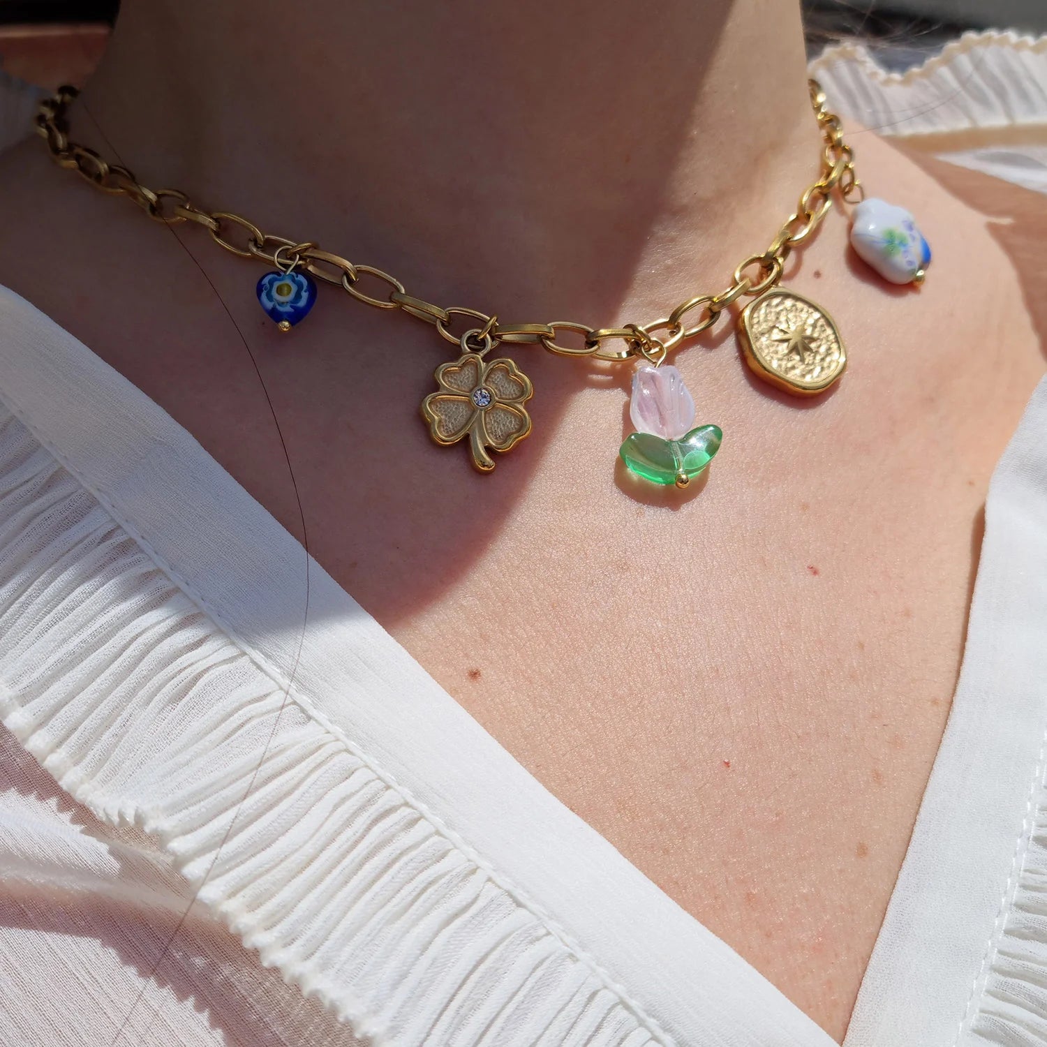 Discover the magic in the details with this handmade gold-plated charms necklace, a piece where whimsy and symbolism unite. This necklace features a stunning mix of charms, including a glass tulip centerpiece, blue evil eye, lucky four-leaf clover, a gold coin compass and a white blue porcelain bead. Crafted to be waterproof and hypoallergenic, it’s designed for everyday elegance. Whether worn solo or layered, this necklace is a modern heirloom that brings together meaningful elements with refined, boho-chic flair.